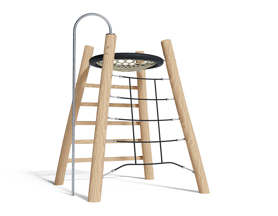 Combinazione d’arrampicata in legno di robinia non trattato chimicamente, levigato, dispositivi di sospensione in acciaio inox, corde mammut rinforzate in acciaio, con parete in rete, palo dei pompieri, scala di risalita e nido d'uccello in nero/beige.