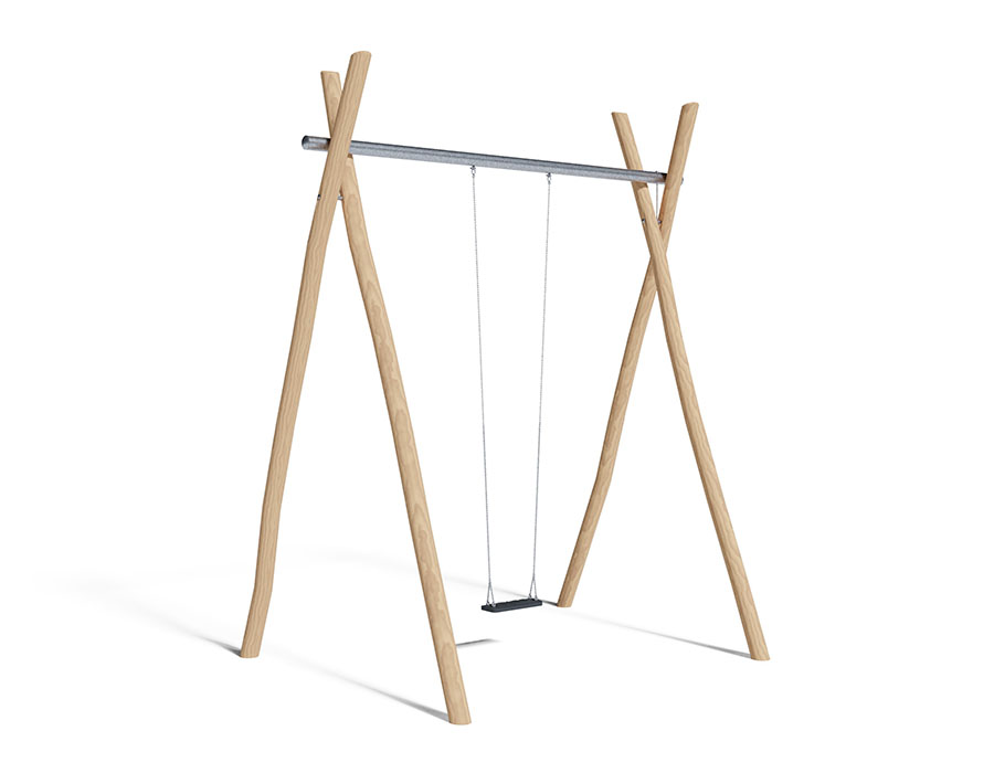 Altalena alta fatto di durame di robinia non trattato chimicamente e levigato, altezza 467 cm, sospensioni d'acciaio inossidabile per un seggiolino, tubo d'acciaio galvanizzati a caldo.