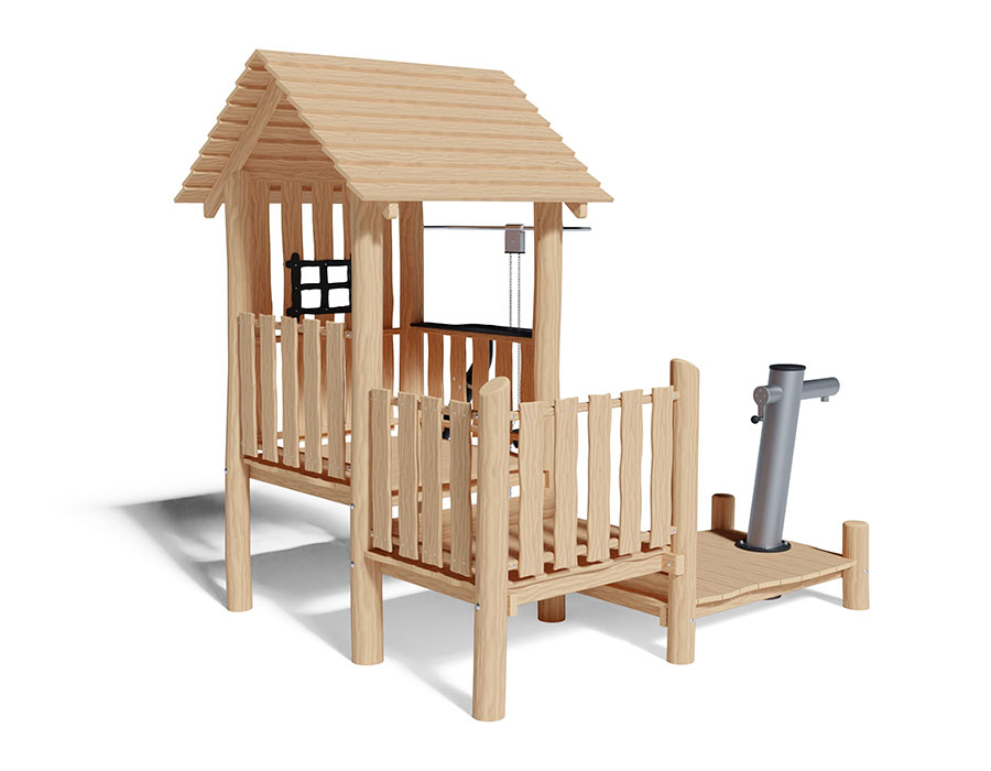 Struttura giochi con sabbia in legno di robinia non trattato chimicamente, levigato, altezza piattaforma 90/60/30 cm, casetta con tetto a due falde, gru a scorrimento, tubo di scarico, ruota a sabbia e pompa rotante automatica.
