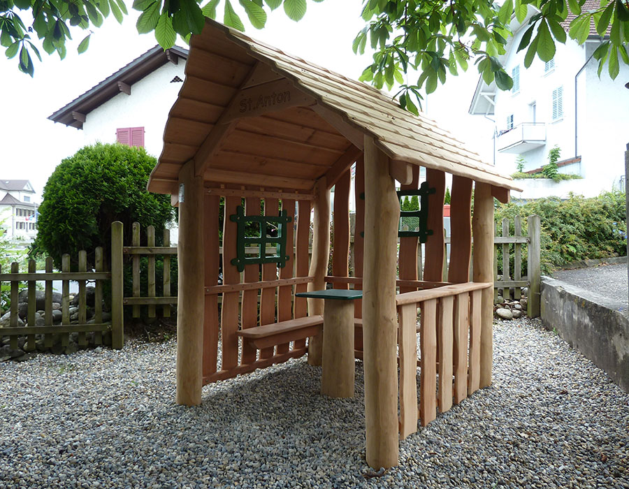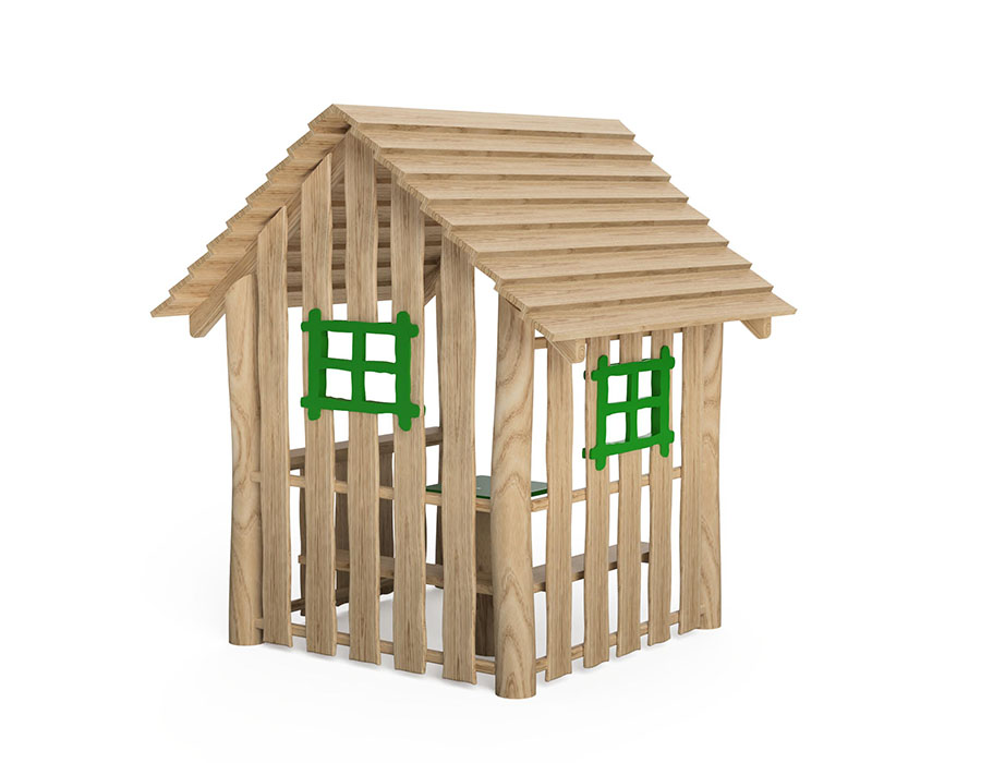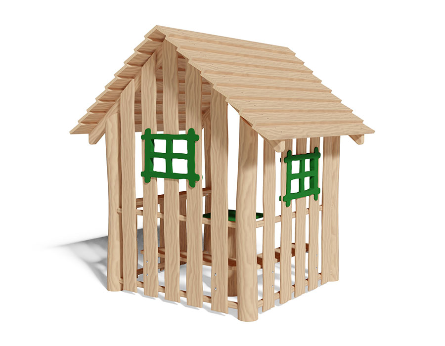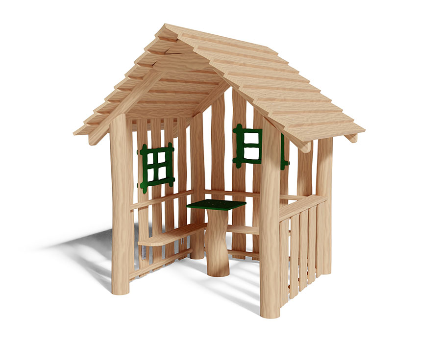 Casa di gioco fatto di durame di robinia non trattato chimicamente e levigato, con tetto a capanna, con panchina e tavolo da gioco, per una profondità di installazione minima di 60 cm.
