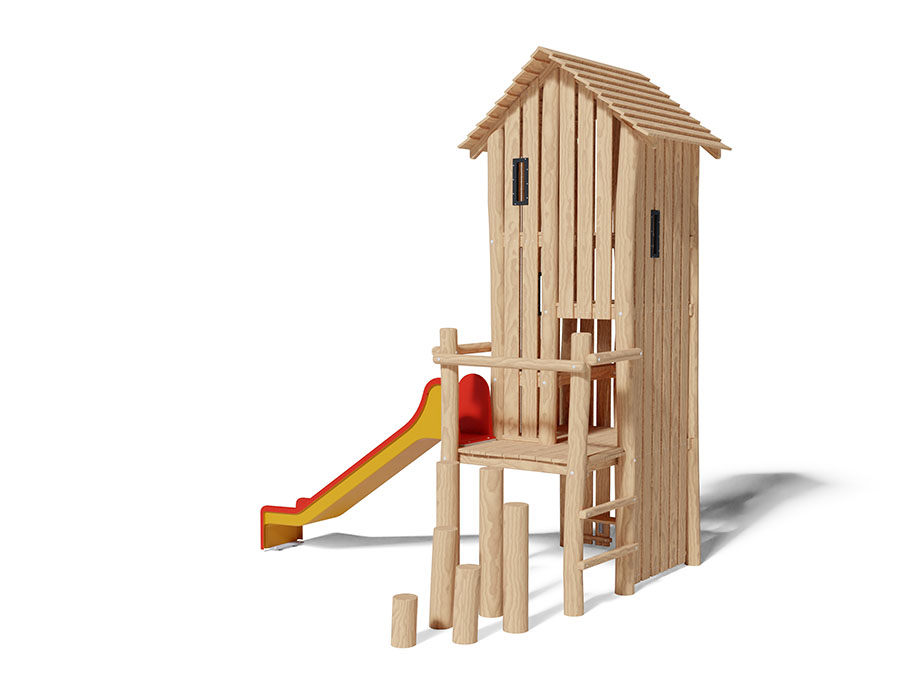Casetta su trampoli in legno di robinia non trattato chimicamente, levigato, altezza piattaforma 120 cm, con tetto a capanna, accesso interno con diverse piattaforme, accesso a pioli e scivolo in poliestere rosso/giallo.