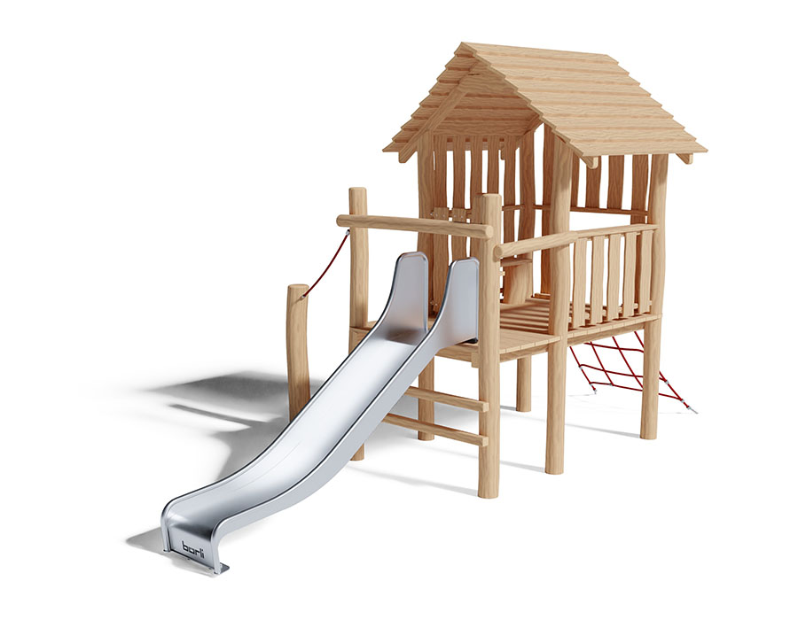 Casetta su trampoli fatto di durame di robinia non trattato chimicamente e levigato, altezza della piattaforma 100 cm, con tetto a capanna, ascesa di piolo, ascesa di tronco d'albero, ascesa di rete rampicante e scivolo d'acciaio inossidabile.