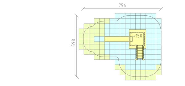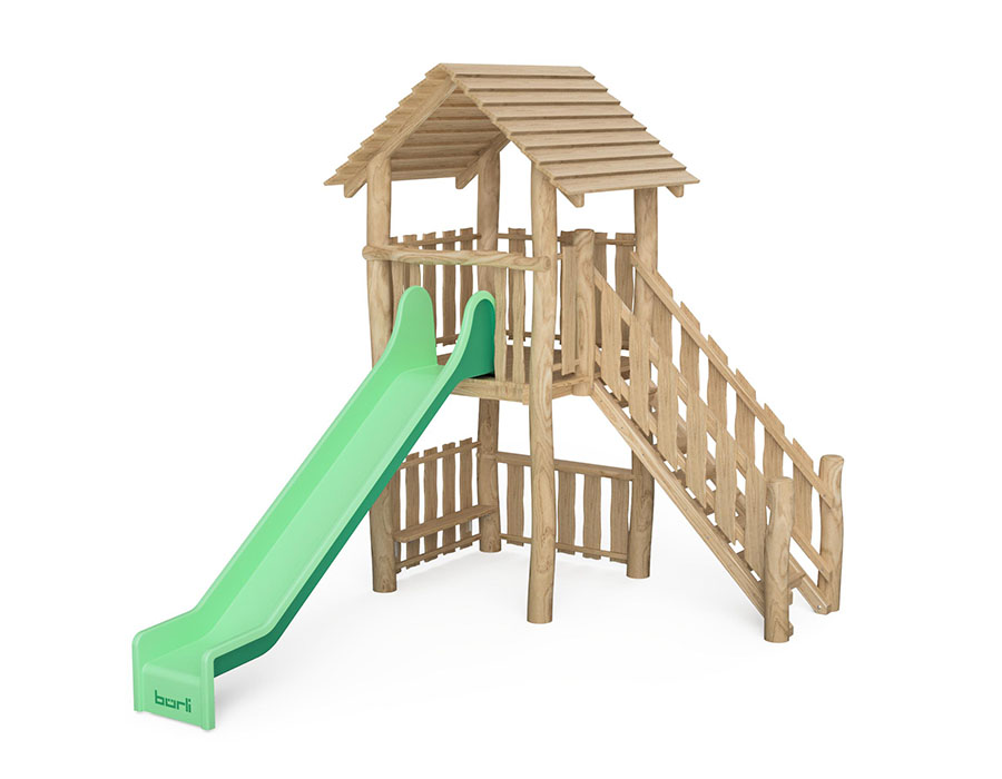 Combinazione di torrete fatta di durame di robinia non trattato chimicamente e levigato, altezza della piattaforma 150 cm, con tetto a capanna, scale, panca da parapetto e scivolo di poliestere armato verde/verde.