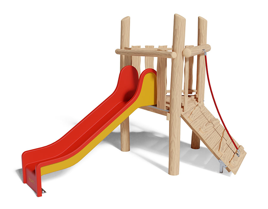 Combinazione di torrete fatto di durame di robinia non trattato chimicamente e levigato, altezza della piattaofrma 90 cm, con ascesa inclinata e scivolo in poliestere rosso/giallo.