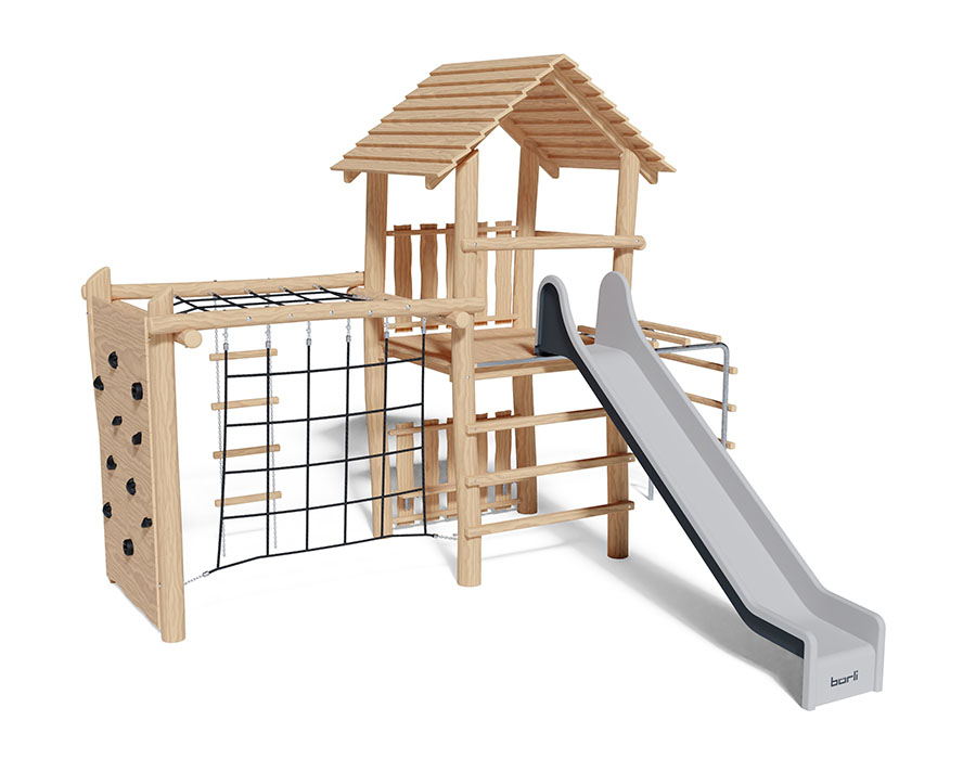 Combinazione di torrete fatta di durame di robinia non trattato chimicamente e levigato, altezza della piattaforma 150 cm, con tetto a capanna, ascesa di piolo, scala a pioli di metallo, scivolo di poliestere armato grigio/antracite, prolungamento di ginnastica combinata con parete d'arrampicata, scala di corda, parete di rete e cielo di rete.