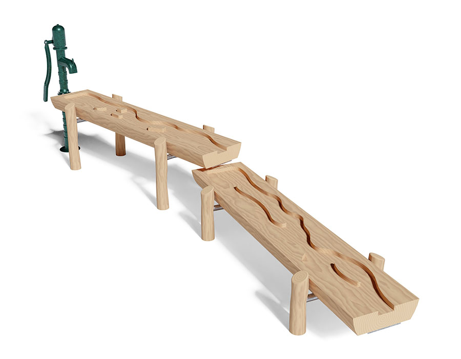 Gioco d'acqua in legno di abete Douglas non trattato, con pompa oscillante per il collegamento diretto alla rete, pali in legno di robinia non trattato chimicamente, levigati, per una profondità di installazione minima di 50 cm.