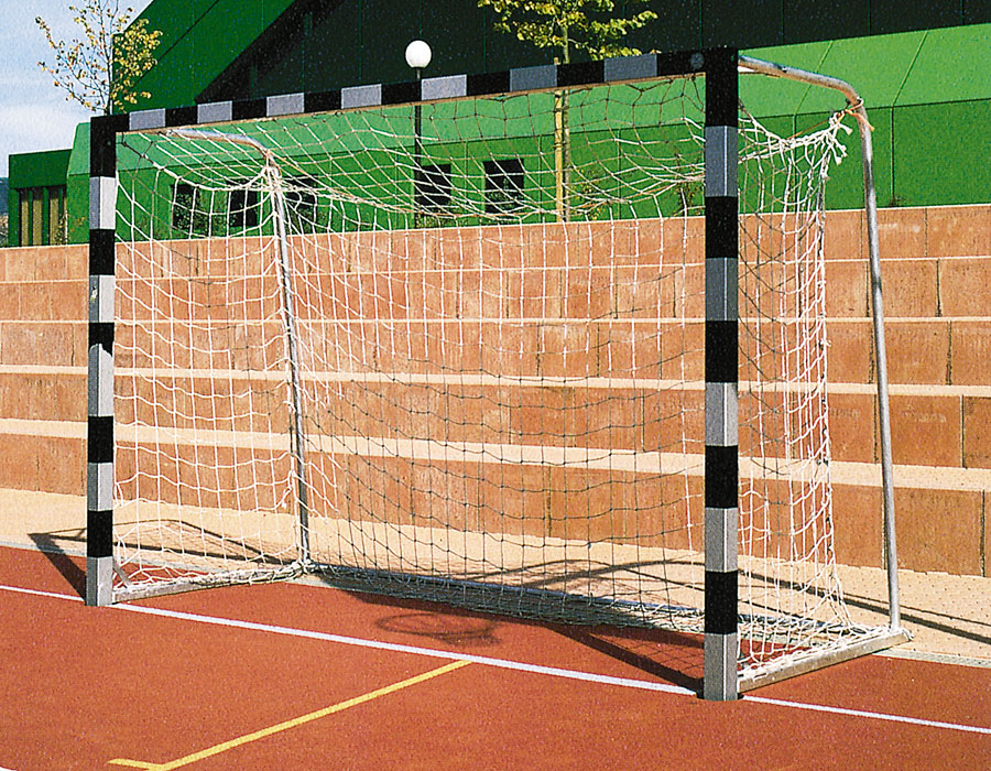 Goal di pallamano in alluminio anodizzato incolore, dimensioni 300 x 200 cm, con marcature in plastica nera, cerchi in rete di sicurezza, con rete e prese di terra, fornito in kit.